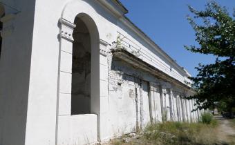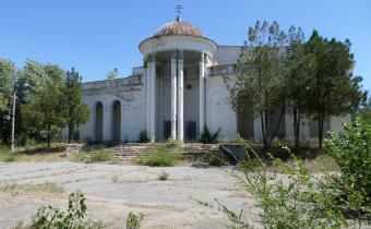 Летний кинотеатр, хотя и предполагает легкость конструкций, на деле – строение довольно-таки монументальное. Купол на входе поддерживают колонны с капителями коринфского ордера, стены с соответствующей орнаментикой. Сваренный на скорую руку восьмиконечный крест на куполе свидетельствует о том, что на здание уже наложила лапу попы. Печально…