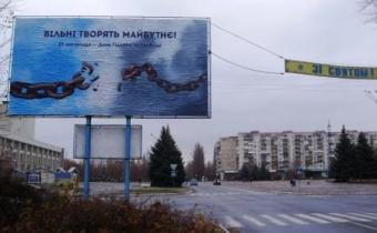 На подступах к рубежанскому городскому совету, на перекрестке между зданиями исполкома и местного дворца культуры красовался бигборд, приуроченный ко «Дню достоинства и свободы».