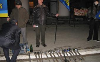 В конце митинга «свободовцы» показательно растоптали флаги с символикой КПУ и Партии регионов, выбросив коммунистические знамена «на свалку истории».