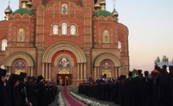 Патриарх Кирилл выступил с приветсвенным словом, после чего подарил от Московского патриархата Свято-Владимирскому кафедральному собору икону Казанской Божьей Матери