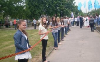 Школьники, лицеисты и студенты образовали по всему городу "живую цепь", держа в руках Георгиевскую ленту. Длина ленты составила 15 км.