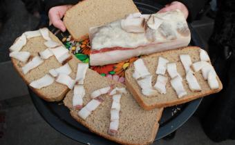 Отвечая на вопрос журналистов о том, кто и в каком объеме финансирует данный перформанс, организатор акции Я. Минкин сообщил, что «акция проведена на личные средства, сало куплено за свои деньги и общий бюджет проведения акции составил 73 гривны».