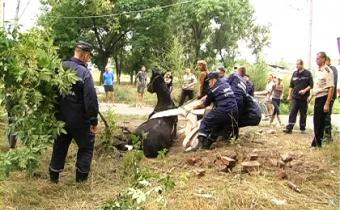Пока спасатели окапывали землю вокруг злополучного места, бедное, измучившееся животное брыкалось и издавало отчаянные звуки. Рядом всё это время находилась хозяйка, которая успокаивала Ласточку и помогала спасателям.