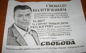 Напомним, 29 марта 2013 г. Изюмский горрайонный суд Харьковской области принял решение об административном аресте председателя Луганской областной организации Всеукраинского объединения "Свобода" А. Заики сроком на 5 суток. Его обвинили в "мелком хулиганстве" - участия в сессии Изюмского райсовета, которая имела целью принять решение о разрешении компании "Шелл". Как отмечено в СМИ, в ходе дебатов на сессии А. Заика разбил стакан с водой и пытался съесть протокол заседания.