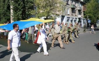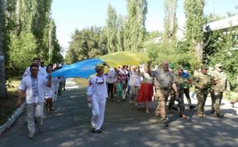 От Шевченко община торжественным шествием направилась к памятнику Герою Украины, освободителю Северодонецка от террористов генералу Александру Радиевскому. Впереди активисты, и среди них сам губернатор, несли огромный сине-желтый флаг.