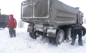 "В снежный плен на подъезде к Волнухино попали грейдер Облавтодора и КамАЗ. Как сообщил водитель грейдера, ему на помощь уже едет еще один грейдер, а пока что он и другие водители пытаются вырвать машины из снега.