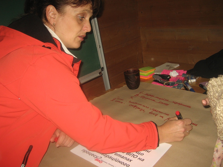 Фасилитатором мероприятия выступила Олеся Архипова, переселенка из Донецка, которая сегодня живет и работает в Ивано-Франковске (ГО «Д.О.М. 48.24»). Она талантливо обеспечивала групповую коммуникацию, применяя ряд энерджайзеров - на сплочение, мотивацию, синергию участников встречи.