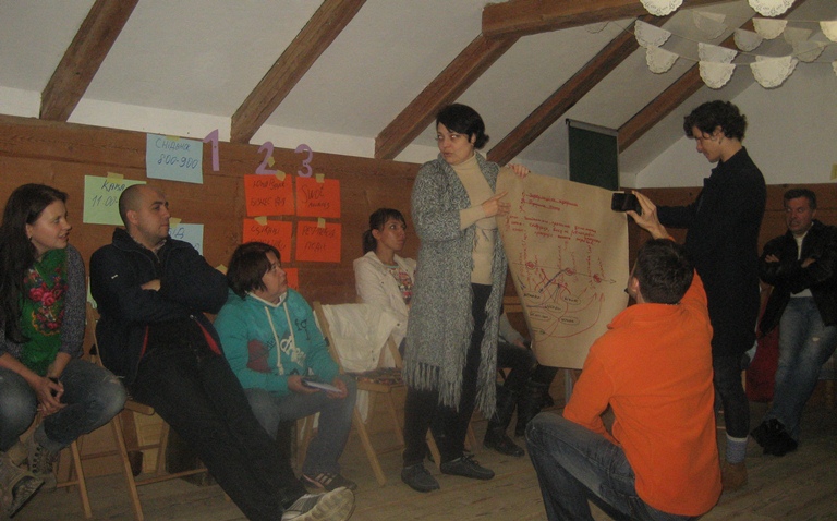 В самом сердце Прикарпатья на Гуцульщине, в Косовском районе, на высокой горе среди смерек и полонин есть Хата-Майстерня. А в Хати Майстерни – группа единомышленников, которые верят в синергию, и в то, что основной принцип сосуществования заключается в формуле 1 + 1 = 3 . Именно здесь в конце сентября, когда осень опустила на Карпаты последние теплые золотые дни бабьего лета, прошла Вторая ежегодная стратегическая встреча общественных организаций, работающих с переселенцами (ВПО). В итоге 3 дня и 2 ночи представители общественных организаций Западной Украины, работающие с ВПО, дискутировали на тему интеграции и дальнейшего развития гражданского движения, обмениваясь интересными практиками работы. Встреча была организована ОО "Д.О.М.48.24" при содействии Агентства ООН по делам беженцев и ОО "Крым SOS"