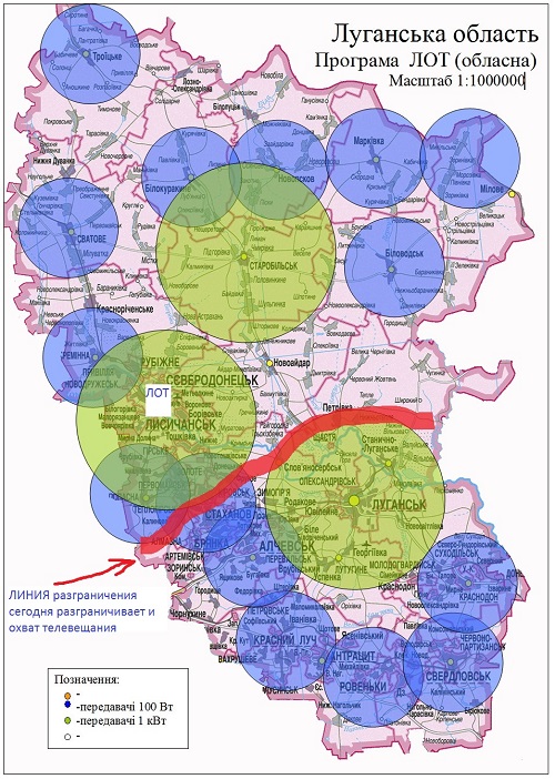 По сути, этим занимается Концерн РРТ, который в Луганской области имеет ряд телевышек. Сейчас два наиболее мощных в два киловатта передатчика находятся в Лисичанске и Старобельске - высота антенн и их мощности хватает на покрытие 30-60 км зоны. На распространение сигнала влияет также высота антенны и рельеф местности. Кабинет министров Украины выделил в 2015 году 1,8 млн. грн. на Луганскую область для закупки нового оборудования для распространения сигнала ЛОТа Концерну РРТ. Однако процедура закупки, монтажа и ввода в эксплуатации новой техники идет очень медленно. Для наглядности мы посмотрели карту охвата телеаудитории ЛОТа, на которой линия разграничения является фактически и линией ограничения распространения сигнала.