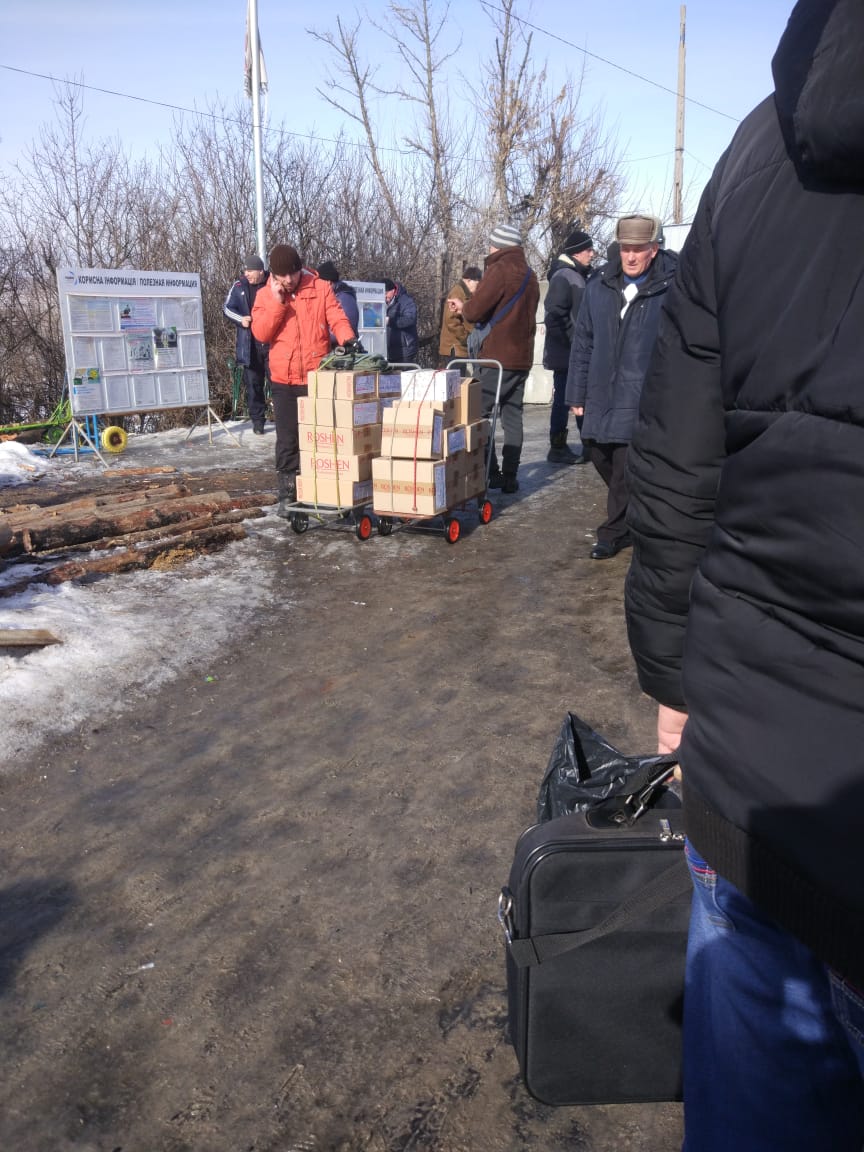 Перед линией разграничения стоят большие фуры, содержимое которых очень быстро, буквально за 20 минут, переносят по мосту на другую сторону Северского Донца, где загружаются ожидающие фуры.