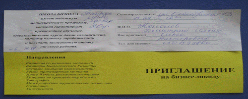 Итак, заполнив первую анкету, вы идете с ней за третий стол, где получаете «допуск» ко второму собеседованию. На второе собеседование вы приходите на следующий день, и, согласно инструкции, приносите с собой … 20-50грн. «За семинарское занятие», - поясняют вам.