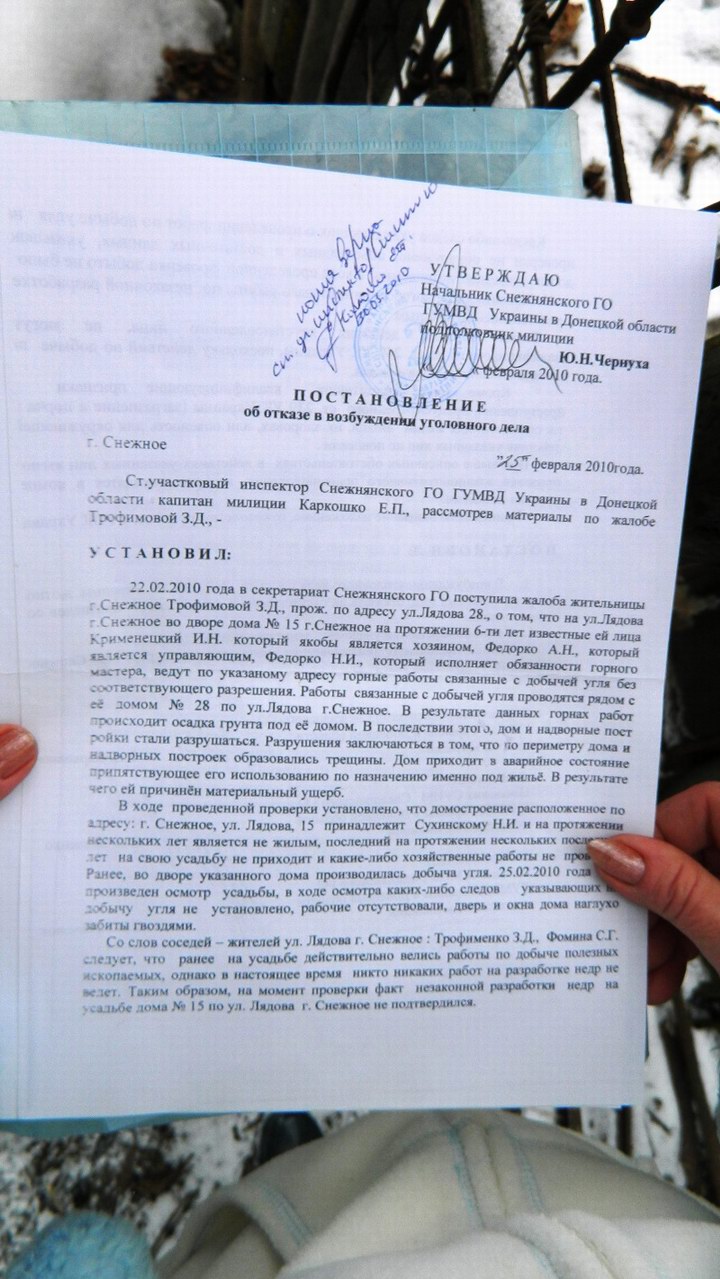 Жители Северного рассказали нам, что многократно жаловались на нелегальные шахты в милицию и писали письмо местным властям, однако никакой реакции на их жалобы не следовало. По словам снежнянки Лидии Сибиркиной, мэр Снежного Доронин в ответ на все просьбы разобраться с копателями, ответил коротко: не лезьте в эти дела! Действовать правоохранители и власти начали лишь после нескольких публикаций о проблемах снежнянцев в СМИ.