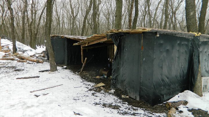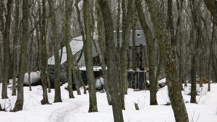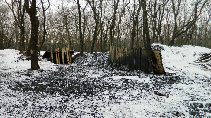 Эта копанка оказалась закрытой. Если в январе на ней нам удалось застать работавших шахтеров, то теперь нас встретила абсолютная тишина. Кайбаш был пуст, в снегу валялись выброшенная рабочая одежда, а вход в «дырку» был забит досками. Правда, такая консервация выглядела явно временной, так как под землю тянулся силовой кабель, а доски были прибиты слишком уж хлипко.