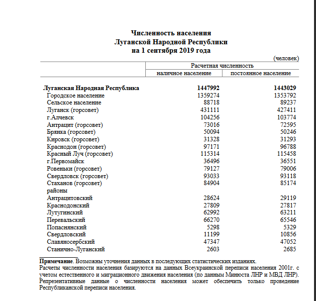 Так, например, на сайте «Госкомстата» на 1 сентября 2019 года в ЛНР постоянно проживает 1 миллион 443 тысячи человек. Городское население составляет 1 миллион 353 тысячи человек, а сельское – 89 тысяч. Это чрезвычайно оптимистичные цифры и к реальности отношения не имеют.