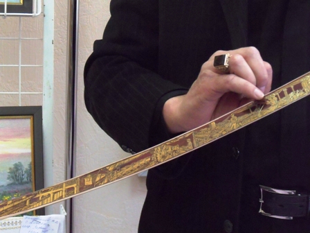 Автор нашел место и для себя: на лезвии сабли запечатлены несколько шахтеров, один из которых - сам Ткаленко. Изображены также брат, и отец автора работы.