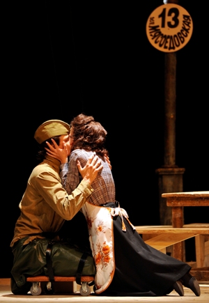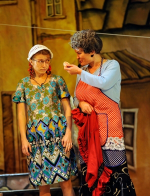 А Баба Маня, по словам ведущего от автора (народный артист Украины Александр Морозов, «певец №1» спектакля , как никогда ранее, показывающий незаурядные диапазоны и красаки своего тенора), неподражаемо рассказывала о своих «усталых ногах», ностальгировала о молодости и косах. У бабы Мани - 4 дочки, у каждой из которых было по 4 мужа ( но все они в продолжение всей пьесы остаются за кадром), а в центре –Тереза или , как ее называют уменьшительно домашние - Теза ( прекрасное сопрано арт. Наталья Стародубцева), которая ждет с фронта своего мужа Лешу.