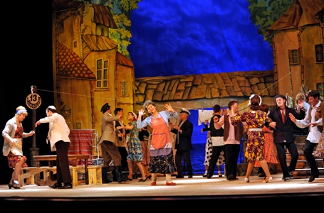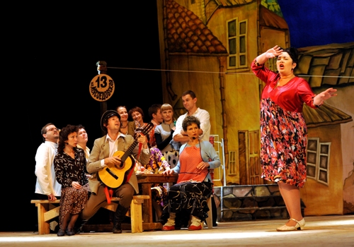 В самом начале пьесы делается основополагающий посыл: дворик живет «дружной многонациональной семьей», он – тот маленький мир, где сфокусировались судьбы маленьких людей и большой страны. Потому в мюзикле звучат ноты и патриотические, и лирические, и куплетные, и фольклорные. А новая музыка и песни стоят рядом со «старыми» шлягерами ( «Шаланды полные кефали», национальными еврейскими мотивами). В таком ассортименте луганская оперетта получилась сочной, смелой, и молодой.