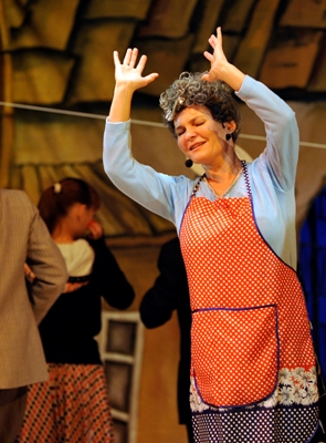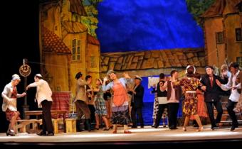 Далее в течение всех трех действий дворик ностальгирует, радуется, смеется, плачет, верит и юморит колоритным еврейским манером. Воодушевляет и радует прекрасное пение и хореография. Музыка. Живая и хмельная, как и вся атмосфера на сцене, она заставляет и зрителей парить и петь, петь – и парить - вместе с героями, порхающими по и даже …над сценой. Заштатностью и провинциализмом с учетом качества вокала и хореографии здесь давно уже не пахнет. Вероятно, именно это, как оказалось, заставило многих зрителей прийти на этот спектакль во второй и даже в третий раз. Некоторые сравнивали луганскую постановку с киевской и говорили, что киевлянам, увы, на сей раз далеко до Луганска. Как и до «луганской» бабы Мани.