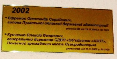 Однако проблемы в коридорах власти этим не исчерпываются. Если, вы войдете в фойе здания Северодонецкого городского совета в правом углу вы и сегодня увидите табличку самого почетного главного партийного регионала области Александра Ефремова при организационно- руководящем содействии которого, свалились все беды на жителей Луганщины, при чем, по обе стороны линии разграничения.