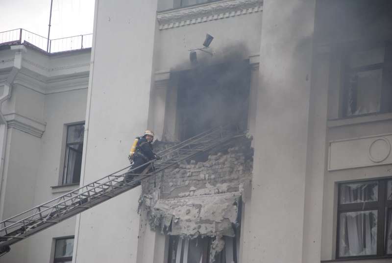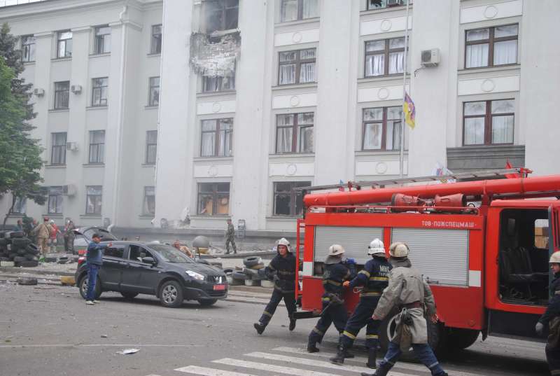 В отчете ОБСЕ за 2 июня 2014 года о трагических событиях говорилось : "Вскоре после 15.00 ракеты поразили захваченное здание региональной администрации. На основании наблюдений представителей СММ, которые располагали неполными данными, удар был нанесен с использованием неуправляемых ракет, выпущенных с самолета. Количество жертв не установлено".
