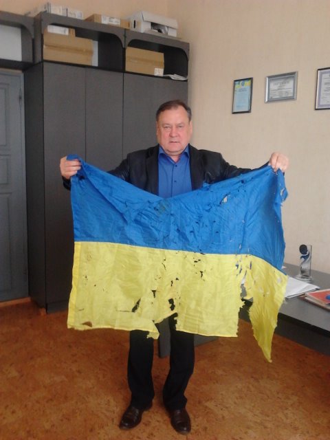 Украинские патриоты доставили в Старобельск изрешеченное осколками знамя из Луганского аэропорта